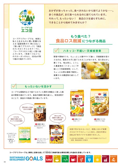 コープデリグループでは、地球と私たち生きものに悪い影響を与える「温室効果ガス(特にCO₂)」「使い捨てプラスチック」「食品ロス」をなくすことをテーマに、「コープデリのエコ活」に取り組んでいます。「未来へつなごう」のスローガンのもと、SDGsの取り組みを進めています。おかずが余っちゃった、食べきれないから捨てようかな……。多くの食品が、まだ食べられるのに捨てられています。それって、もったいない!食品ロスを減らすために、できることから始めてみませんか?もう食べた?食品ロス削減につながる商品ハネッコ・不揃い・天候被害果野菜や果物のうち、ちょっとした傷やサイズ違い、天候被害を受けたものは、販売されずに捨てられることがあります。見た目は少し悪くても、味は同じ。こうした農産物を「ハネッコ」「不揃い」「天候被害果」として、ちょっとお得な価格で販売し、廃棄される農産物を減らしています。もったいないを活かすコープでは規格外などで捨てられていた原料を無駄なく使った商品の開発を進めています。食品の廃棄を極力減らし、有効活用することで、食品ロス削減に取り組んでいます。豆乳を絞った後のおからを使用サラダを製造する際に出るキャベツの芯を使用芋けんぴを製造する際に出るかけらを使用国産小麦とおからのドーナツ(Ca入り)ざくざくブロックチョコレート(芋けんぴ入り)とうもろこしとキャベツのポタージュ※宅配のみ取り扱っています完熟バナナスムージー完熟バナナのたまごパン(Ca)本数や形が合わないなど、規格に沿わず廃棄されるバナナをピューレに加工。2023年度は386,247本のバナナを活用できました。※上記2品の合計数値、バナナ1本の可食部を75グラムで試算。製品歩留まり計算外コープデリグループは、事業と活動を通して「SエスディージーズDGs(持続可能な開発目標)」の達成を目指しています。05