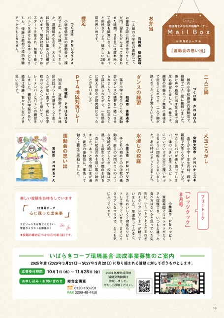 10・・・組合員さんからの投稿コーナー*今月のテーマ*「運動会の思い出」お弁当石岡市桜井真弓一人娘の小学校の運動会で、お重箱3段に料理を作りましたが雨。翌日もがんばって作るもまた延期。3日目には疲れ果てて品数も簡素になり、おにぎりと卵焼きでした。懐かしい28年前の思い出です。裸足つくば市PNしゅうメメ小学校低学年の運動会は、裸足で走ったり踊ったりしました。運動場の小石を、大人と一緒に徹底的に拾い集めた記憶があります。地区対抗リレーではスタートを任され、無事1番でバトンを渡せた時はホッとしました。優勝は最初の成功体験だったかもしれません。二人三脚大玉ころがしつくば市PNMOA娘の小学校最後の運動会で、母娘で二人三脚に挑戦しました。掛け声や最初に出す足を家で何度も練習しました。本番では、練習の甲斐あって無事に最後まで走ることができ、二人で胸が熱くなったことを覚えています。PNハナミズキ常陸大宮市息子が小学1年生の時、親子競技で大玉ころがしをしました。やたらとパパが張り切ってしまい、体の小さい息子はスピードについていけず大玉に覆いかぶさるように回転してしまいました。あの時はヒヤッとしました。ダンスの練習水浸しの校庭小美玉市PNパプリカ子どもの初めての小学校の運動会。前日の大雨がウソのような快晴の朝でしたが、校庭は水浸し。上級生たちが雑巾を持ち一斉に校庭の水を吸い取り始めました。あっと言う間に水が消え、青空の運動会に。率先して動く上級生に感動しました。運動会の思い出常総市PN光ちゃん結城市後藤通子孫が小学1年生のころ、運動会のダンスの練習を一緒にさせられました。なかなか出来なくて孫に怒られながら、一生懸命に覚えて体中が筋肉痛になったことがありました。PTA地区対抗リレー30茨城町PNはなはな年前、運動会でPTA地区対抗リレーの選手として走ったことが思い出です。夜に小学校のグラウンドを借りて、リレーメンバーとバトンの練習をしました。練習の甲斐があり、結果は優勝!若かりし日のよき思い出です。フリートーク「レッツクック」8月号小美玉市PNハッピー家庭菜園でミニトマトがたくさん収穫でき、いつもと違った食べ方はないかと思っていた矢先に、「ミニトマトとたまねぎのイタリアンマリネ」が載っていました。早速作ってみると、とてもおいしくて何度もリピートして作っています。まさにイタリアンなマリネで、とても気に入っています。楽しい投稿をお待ちしています12月号テーマ心に残った出来事エピソードをお寄せください。写真やイラストを募集中!⃝投稿の締め切りは10月10日(金)です。いばらきコープ環境基金助成事業募集のご案内2026年度(2026年3月21日~2027年3月20日)に取り組まれる活動に対して行うものとします。応募受付期間10月1日(水)~11月28日(金)お申し込み・お問い合わせ総合企画室0120-160-231FAX0299-48-44582024年度助成団体活動発表動画を作成しました。ぜひ、ご視聴ください。
