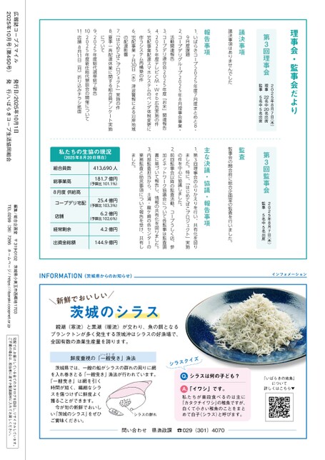 理事会・監事会だより第3回理事会2025年8月7日(木)0名出席理事2監事5名中5名出席2名中2第3回監事会2025年8月7日(木)監事5名中5名出席議決事項監査議決事項はありませんでした監事会の開会前に総合企画室の監査を行いました。報告事項1.いばらきコープ2025年度7月度まとめと8・9月度課題2.コープデリグループ2025年8月理事会事業・活動関連報告3.コープデリ連合会2025年度「お米」関連報告4.2025年度テレビCM・Web広告実施の件5.宅配事業配達スマホシステムのベンダ体制変更に伴うシステム再構築の件6.宅配事業7月30日(水)津波警報による沿岸地域の配達影響7.「はじめてばこプロジェクト」実施の件8.夏季一斉配達休業に関する組合員アンケート実施について9.2025年度総代選挙終了報告10.2025年度新任総代懇談会の開催について店舗8月11日(月)折り込みチラシ紙面.11主な決議・協議・報告事項1.第3回理事会のふりかえりを行い、共有化を図りました。特に、「はじめてばこプロジェクト」実施の件を中心に協議しました。2.前回監事会以降の監査活動、コープうしく店、参加とネットワーク協議会について各監事は監査調書に基づいて報告し、情報の共有化を図りました。3.内部監査担当から、土浦・龍ケ崎の各センターの業務監査と助言事項について報告を受け、共有しました。私たちの生協の現況(2025年8月20日現在)組合員数総事業高8月度供給高コープデリ宅配店舗経常剰余413,690人181.7億円(予算比101.1%)25.4億円(予算比103.3%)6.2億円(予算比102.6%)4.2億円出資金総額144.9億円(茨城県からのお知らせ)インフォメーション\新鮮でおいしい/茨城のシラス親潮(寒流)と黒潮(暖流)が交わり、魚の餌となるプランクトンが多く発生する茨城沖はシラスの好漁場で、全国有数の漁業生産量を誇ります。鮮度重視の「一いっそう艘曳びき」漁法茨城県では、一艘の船がシラスの群れの周りに網を入れ巻きとる「一艘曳き」漁法が行われています。「一艘曳き」は網を引く時間が短く、繊細なシラスを傷つけずに鮮度よく獲ることができます。今が旬の新鮮でおいしい「茨城のシラス」をぜひご賞味ください。シラスクイズQ.シラスは何の子ども?A.「イワシ」です。私たちが普段食べるのは主に「カタクチイワシ」の稚魚ですが、白くて小さい稚魚のことをまとめて白子(シラス)と呼びます。「いばらきの地魚」について詳しくはこちら▶シラスの群れ問い合わせ県漁政課☎029(301)4070広報誌コープスマイル2025年10月号(第450号)発行日/2025年10月1日発行/いばらきコープ生活協同組合編集/総合企画室〒319-0102茨城県小美玉市西郷地1703TEL.0299(36)7266ホームページ/https://ibaraki.coopnet.or.jp宅配では、お届けしている全てのカタログを回収し、リサイクルしています。ご不要の場合は、担当者に渡すか配達器材に入れてお戻しください。
