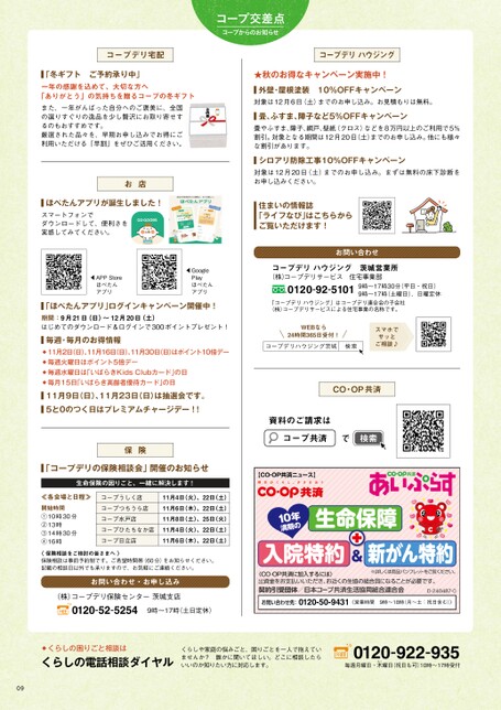コープ交差点コープからのお知らせコープデリ宅配コープデリハウジング「冬ギフトご予約承り中」一年の感謝を込めて、大切な方へ「ありがとう」の気持ちを贈るコープの冬ギフトまた、一年がんばった自分へのご褒美に、全国の選りすぐりの逸品を少し贅沢にお取り寄せするのもおすすめです。厳選された品々を、早期お申し込みでお得にご利用いただける「早割」をぜひご活用ください。お店ほぺたんアプリが誕生しました!スマートフォンでダウンロードして、便利さを実感してみてください。◀APPStoreほぺたんアプリ◀GooglePlayほぺたんアプリ「ほぺたんアプリ」ログインキャンペーン開催中!期間:9月21日(日)~12月20日(土)はじめてのダウンロード&ログインで300ポイントプレゼント!毎週・毎月のお得情報❖11月2日(日)、11月16日(日)、11月30日(日)はポイント10倍デー❖毎週火曜日はポイント5倍デー❖毎週水曜日は「いばらきKidsClubカード」の日❖毎月15日「いばらき高齢者優待カード」の日11月9日(日)、11月23日(日)は抽選会です。5と0のつく日はプレミアムチャージデー!!保険「コープデリの保険相談会」開催のお知らせ生命保険の困りごと、一緒に解決します!≪各会場と日程≫開始時間①10時30分②13時③14時30分④16時コープうしく店コープつちうら店コープ水戸店コープひたちなか店コープ日立店11月4日(火)、22日(土)11月6日(木)、22日(土)11月8日(土)、25日(火)11月4日(火)、22日(土)11月6日(木)、22日(土)〈保険相談をご検討の皆さまへ〉保険相談は事前予約制です。ご希望時間帯(60分)をお知らせください。記載の相談日以外でも承りますので、お気軽にご連絡ください。お問い合わせ・お申し込み(株)コープデリ保険センター茨城支店0120-52-52549時~17時(土日定休)★秋のお得なキャンペーン実施中!外壁・屋根塗装10%OFFキャンペーン対象は12月6日(土)までのお申し込み。お見積もりは無料。畳、ふすま、障子など5%OFFキャンペーン畳やふすま、障子、網戸、壁紙(クロス)などを8万円以上のご利用で5%割引。対象となる期間は12月20日(土)までのお申し込み。他にも様々な割引があります。シロアリ防除工事10%OFFキャンペーン対象は12月20日(土)までのお申し込み。まずは無料の床下診断をお申し込みください。住まいの情報誌「ライフなび」はこちらからご覧いただけます!お問い合わせコープデリハウジング茨城営業所(株)コープデリサービス住宅事業部0120-92-51019時~17時30分(平日・祝日)9時~17時(土曜日)、日曜定休「コープデリハウジング」はコープデリ連合会の子会社(株)コープデリサービスによる住宅事業の名称です。WEBなら24時間365日受付!コープデリハウジング茨城検索スマホでサッとご相談♪CO・OP共済資料のご請求はコープ共済で検索0120-50-9431《営業時間9時~18時(月~土:祝日含む)》❖くらしの困りごと相談はくらしの電話相談ダイヤルくらしや家庭の悩みごと、困りごとを一人で抱えていませんか?誰かに聞いてほしい。どこに相談したらいいのか知りたい方に対応します。0120-922-935毎週月曜日・木もく曜日(祝日も可)10時~17時受付09