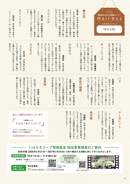 ・・・組合員さんからの投稿コーナー*今月のテーマ*「好きな花」梅の花水戸市PNサムちゃんのママまだ冷たい空気の中、春を知らせてくれるように枝を青空に伸ばし、可憐ながらも力強く咲く梅の花は、華やかで甘い香りがします。特に、白梅の清潔な佇まいにひかれます。フリージア桜川市PN野良ポトスフリージアの香りをかぐと春を感じウキウキします。来年は八重のフリージアに挑戦したいです。スイートピー水戸市PNきょんぴースイートピーは、白や淡いピンクの色がキュートで華やかです。卒業式でよく見かけます。新たな門出に向けて、柔らかさの中にも力強さを感じる花です。チューリップ鉾田市石﨑郁子チューリップは春に咲く花です。日中の暑い日には、ぐったりしているのに朝夕はシャキッとしている姿が人間的で可愛いです。ひまわり潮来市PNさか夏の花、ひまわりが大好きです。黄色の花で暑い夏をがんばれよ!と元気づけてくれているようです。今年はたくさんの種がとれました。来年は時期をずらして、たくさん咲かせようと思っています。コスモス牛久市PNもいもいコスモスは可愛い花だけど、どんな土地でも咲き、強い風にも負けない強さがあるところが好きです。バラマーガレットPNミスラベンダー石岡市派手なイメージのバラですが、オールドローズなど優しいバラもあり、魅せられてしまってから自宅の庭で育てています。フラワーパークでのボランティアにも参加して、四季折々のバラに癒されています。紫色の桔梗常陸大宮市PNあずき桔梗は紫色・青色・白色・ピンクなどの色がありますが、なんといっても紫色の桔梗が好きです。星形のなんとも可憐で凛とした見た目が大好きです。つぼみも可愛いです!金魚草常総市PN原坊名の通り、花びらが金魚に似ていてプクッとしているところが、なんとも可愛いです。毎年、月中旬ごろに苗を植え、春先10に咲きます。とても心が和み、優しい気持ちになります。笠間市PNむぎっこマーガレットは見た目が可愛いので大好きです。花束をプレゼントする時は、必ず入れてもらいます。金木犀利根町PNReiちゃん秋の代表的な花の金木犀は、小さなオレンジ色の花で、なんといっても特徴的な香りがあります。あの香りをかぐと幸福な気分になります!楽しい投稿をお待ちしています1月号テーマどんな1年にしたい?エピソードをお寄せください。写真やイラストを募集中!⃝投稿の締め切りは11月10日(月)です。いばらきコープ環境基金助成事業募集のご案内2026年度(2026年3月21日~2027年3月20日)に取り組まれる活動に対して行うものとします。応募受付期間10月1日(水)~11月28日(金)募集要項・申請書は、こちらからご確認・ダウンロードいただけます。▶2024年度助成団体活動発表動画を作成しました。ぜひ、ご視聴ください。お申し込み・お問い合わせ総合企画室0120-160-231FAX0299-48-4458https://x.gd/unpf9https://x.gd/qz0U310
