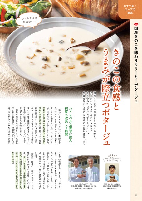 国産きのこを味わうクリーミーポタージュ02おすすめ!コープの商品きのこの食感とうまみが際立つポタージュ国産エリンギの食感とまいたけの香り、じゃがいもとたまねぎのうまみ。まろやかな口どけのポタージュは、牛乳を加えて温めるだけの手軽な逸品です。ハイレベルな要求に応え何度も改良して提案温かいスープがおいしい季節ですね。「CO・OP国産きのこを味わうクリーミーポタージュ」は、おいしさにこだわったコープクオリティ商品。牛乳を加えて温めるだけで、本格的な味わいを楽しめると大人気です。原料には生のエリンギと水煮のまいたけ、ぶなしめじから作ったエキスを使用。まいたけは2種類の大きさにカットして食感に変化をつけ、じゃがいもやたまねぎのうまみも楽しめます。開発を担当した理研ビタミン株式会社(東京都新宿区)の藤ふじいじゅんすけ井淳介さんには、以前からうまみたっぷりのきのこレトルトとは思えない!左から株式会社アーデン技術品質管理室美齊津哲也さんと得意先部市川一則さん理研ビタミン株式会社草加工場食品技術開発部藤井淳介さんスープの構想がありました。しかしうまみは認められたものの、「もう一工夫ほしい」「もっと具だくさんに」と却下続きに。諦めかけながらも“エリンギを生で仕込む”という提案をすると、OKが出て一気に話が進んだといいます。「結局、開発に1年半かかりました。生の材料を使うことは珍しいのですが、エリンギを生から工場でゆでることで、具材感とうまみの感じられる、コープクオリティらしい商品ができあがりました」