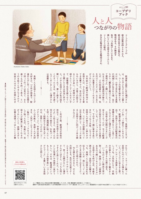 エピソード60コープデリブックコープデリグループの組合員数は約550万人。組合員の皆さんの数だけ、物語がある。その物語を毎月一つお届けしていきます。描いているのは皆さんのくらしとコープデリの接点。あなたの物語はどんな物語ですか。ろこ新潟県上越市に住む博ひ子さんは、夫と子ども2人の4人暮らし。コープの宅配を始めたきっかけは、小学3年生になる長男の幸こうせい誠くんが生まれた頃、友だちから「離乳食を届けてもらえて便利だよ」と聞いたこと。これまで何人か配達担当が替わったが、どの担当者も「お体、気を付けてくださいね」などあたたかい言葉をかけてくれることがうれしいという。6年前から配達を担当する吉田さんは、3人の子どもを育てる先輩ママだ。年の近い子どももいるから、子育ての話をすることが多い。「幸誠は小さい頃からじっとしていられない子で、幼稚園で先生を困らせていると聞いたときは本当に辛かった。だから吉田さんが私の話を聞いてくれて、優しく励ましてくださったときは、思わず涙ぐんでしまいました」と博子さんは感謝する。………§………幸誠くんも吉田さんのことが大好きだ。「工作が得意で、配達のたびに作ったものを玄関まで持って行っては見せて、また違うものを持って来る、というのを延々とやるんですけど、吉田さんはそれに全部に付きillustration:MaikoDake合ってくれて。幸誠のことを『すごいね』って褒めてくれるんです。配達を終えても一緒に外に出て、吉田さんが次の配達先の準備をする様子をじっと見ているんですよ」と博子さんは話す。小学校入学以降はたまにしか会えなくなったが、今でも配達日が祝日などで会えると大喜びしている。「テンションが上がって、下の子と一緒に家中を走りまわってもう大変。『もうすぐ吉田さんが来るよ』と声をかけると、リビングの窓際に行っては外を確認して、トラックが来ると吉田さんに向かって手を振るんです」………§………1年ほど前、配達日が学校の休日で、「今日は吉田さんの日だよ」と伝えると、幸誠くんは何かを作り始めた。牛乳パックを切ったり画用紙に貼ったりして、1時間ほどで出来上がったのは、世界に一つだけの『コープデリブック』。中身は吉田さんへの手紙と、幸誠くんが大好きな、人気ゲームキャラクター一覧のシールブックをコピーして貼ったもの。手紙には、吉田さんが配達に来てくれるのがうれしいこと、休憩しながら仕事を頑張ってほしいことが書かれていて、トラックに乗った吉田さんのイラストも描かれていた。「久しぶりに会えると思って、プレゼントを用意したんでしょうね。2年生になり、手紙の文章もしっかりして驚きました」と博子さんは振り返る。いつものように商品を受け取った後、幸誠くんが「発表があるので聞いてもらえますか」と吉田さんを呼び止め、手紙を読み上げた。吉田さんは驚きつつも、幸誠くんに何度もお礼を伝えていたが、後になって「あのときは感動して泣きそうだった」と打ち明けられた。今も顔を合わせると、子どもの話になる。先日は「兄弟でゲームをするとすぐけんかになって、言っても聞かない」と博子さんがこぼすと、「うちも同じですよ」と返してくれた。ちょっとした気遣いや共感の一言がうれしい。それは、配達時にいつもトラックの助手席に『コープデリブック』を置いている吉田さんも同じだ。過去の物語もこちらから読めますあなたのエピソードをお寄せください。コープ職員との心に残る出来事を随時募集しています。氏名・電話番号・組合員コードを記入し、郵便(〒336-8526埼玉県さいたま市南区根岸1-4-13コープデリ連合会コミュニケーション推進部宛)か、左記のWeb応募フォームよりお送りください。♦実際にあったコープに関わる人と人との交流を取材し、読み物の形にまとめています。登場する人物の名前は仮名の場合があります。イラストはイメージです。07