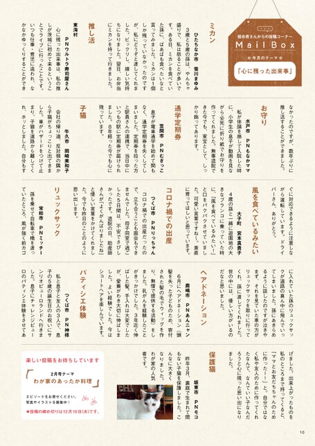 *今月のテーマ*「心に残った出来事」・・・組合員さんからの投稿コーナーミカンひたちなか市笹川まゆみ3歳と5歳の孫は、やんちゃ盛りで、私は怒ることが多いです。ある日、ミカンを食べていた孫に、ばあばも食べたいなと言ってみました。ミカンは1個しか残っていなかったのですが、私にどうぞと渡してくれました。ビックリし、嬉しい気持ちになりました。翌日、お弁当にミカンを持って行きました。推し活東海村なかったのですが、数年ぶりに推し活することができました。お守り水戸市PNもなかママ私が体調を崩して入院した時に、小学生の息子が動画を見ながら必死に折り紙でお守りを作ってくれました。無事退院できた今でも、家宝として、しっかり飾ってあります。通学定期券笠間市PNむぎっこ息子が電車通学を始めて間もなく、通学定期券を失くしてしまいました。定期券を拾った方と駅員さんの連携で、当日中にいつもの駅に定期券が届けられました。8年経った今でも心に残っています。子猫PNウルトラ寿司屋さん心に残った出来事は、私の推しが茨城に初めて来るということでライブに行ったことです。いつも仕事・育児に追われ、なかなかゆっくりすることができ牛久市岡崎美和子会社の帰り道、反対側の隅から子猫がちょっこりと出てきました。車がハザードをつけて止まり、子猫を道路から離してくれ、ホッとしました。自分もすぐに対応できるように注意しながら運転しています。ドライバーさん、ありがとう。風を食べているみたい大子町宮本真貴子4歳の孫と一緒に遊園地の大きなブランコに乗っていた時に、「風を食べているみたい!」と口をパクパクさせていました。可愛い言葉ですね~。素直に育ってほしいと思っています。コロナ禍での出産つくば市PNりっちゃんコロナ禍での出産だったので、立ち合うことも面会もできませんでした。母子同室で過ごした5日間は、不安でさびしかったです。退院の日、助産師さんが「よくがんばりましたね」と優しい言葉をかけてくれました。今でも昨日のことのように思い出します。リュックサック常総市PNミッチー孫を乗せて自転車で橋を渡っていたところ、風が強く前カゴに入れていた孫のリュックサックが道路の真ん中に飛んでいってしまいました。孫にあきらめるように話したのですが泣きやまず、それを見ていた車の方がリュックサックを取りに行ってくれ、孫に渡してくれました。世の中には、優しい方がいるのだなと思いました。ヘアドネーション鹿嶋市PNあんニャン6月にヘアドネーション(頭髪を失った子どものため、寄付された髪の毛でウィッグを作り、無償で提供する活動)をしました。乳がんを経験したことがきっかけでした。3年近く伸ばした髪。手入れは大変でしたが、愛着がわき大切に伸ばしました。よい経験でした。今はショートヘアを楽しんでいます。パティシエ体験つくば市PN神様私と息子と友人の3人で、息子の5歳の誕生日のお祝いにサンリオピューロランドへ行きました。息子にチャレンジピューロのパティシエ体験をさせてあ10げました。出来上がったものを私のところまで持ってくると、「ママとお友だちちゃんのために作ったー!」と。自分ではなく私や友人のために作ってくれたなんて、なんていい子なんだろうと心に残った思い出になりました。保護猫坂東市PNモコ昨年3月、裏庭で生まれて間もない子猫を保護しました。こんなに大きくなりました。わが家の人気者です。楽しい投稿をお待ちしています2月号テーマわが家のあったか料理エピソードをお寄せください。写真やイラストを募集中!⃝投稿の締め切りは12月10日(水)です。