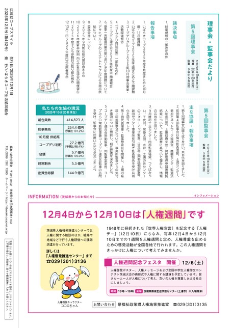 理事会・監事会だより0月9日(木)2025年10名出席理事2監事5名中5名出席2名中2第5回理事会議決事項1.就業規則の一部改定の件報告事項1.いばらきコープ2025年度9月度まとめと10月度・11月度課題2.いばらきコープ2025年度上期まとめと下期課題3.コープデリグループ2025年10月理事会事業・活動関連報告4.「コープデリ商品政策」一部改定の件5.コープデリ連合会2025年度産米関連報告6.夏季一斉配達休業の振り返りと次年度課題について7.アサヒグループのシステムトラブルによる商品供給について8.委託会社について9.2025年9月新任総代懇談会まとめ1110.2026年度新卒採用内々定者交流会の開催報告2025年度子ども参観日の取り組み報告.1210.月1日2025年度内定式開催報告第5回監事会0月9日(木)2025年1監事5名中5名出席主な協議・報告事項1.第5回理事会の振り返りを行い、共有化を図りました。2.前回第4回監事会以降の監査活動、土浦センター、参加とネットワーク協議会、鹿嶋センター監査法人往査立会、上期経費支出・資産取得申請書閲覧結果について。監査調書に基づいて報告し、情報の共有化を図りました。3.9月度の十王センター内部監査結果、つくばみらい、千代川、常陸太田、水戸、土浦の各センターのフォローアップ監査、日立店上期委託棚卸監査、鉾田センター事業所長引継ぎ監査報告を受け共有化を図りました。4.第2回代表理事・監事懇談会を開催し、上期の経営上の重要事項について、事業所監査からの気付き事項について懇談し、相互認識を深めました。5.コープデリ連合会常勤監事、同監事室室長、コープみらい常勤監事兼コープデリ連合会監事の訪問を受け、監事会に出席いただき交流しました。私たちの生協の現況(2025年10月20日現在)組合員数総事業高10月度供給高コープデリ宅配店舗経常剰余414,823人254.4億円(予算比101.2%)27.2億円(予算比98.4%)5.7億円(予算比105.0%)5.3億円出資金総額144.9億円(茨城県からのお知らせ)インフォメーション12月4日から12月10日は「人権週間」です茨城県人権啓発推進センターでは人権に関する相談のほか、職場や地域などで行う人権研修への講師派遣を行っています。詳しくは「人権啓発推進センター」まで☎029(301)31361948年に採択された「世界人権宣言」を記念する「人権デー」(12月10日)にちなみ、毎年12月4日から12月10日までの1週間を人権週間と定め、人権尊重を広めるための啓発活動が全国各地で行われます。この人権週間をきっかけに人権について考えてみませんか。人権週間記念フェスタ開催12/6(土)人権啓発ポスター、人権メッセージおよび全国中学生人権作文コンテスト茨城大会の表彰式や人権に関する講演を予定しています。皆さん一人一人が人権について考え、互いの人権を尊重しあえる社会にしましょう。時間13時~16時会場茨城県県南生涯学習センター(土浦市)※入場無料人権啓発キャラクターココロちゃんお問い合わせ県福祉政策課人権施策推進室☎029(301)3135広報誌コープスマイル2025年12月号(第452号)発行日/2025年12月1日発行/いばらきコープ生活協同組合編集/総合企画室〒319-0102茨城県小美玉市西郷地1703TEL.0299(36)7266ホームページ/https://ibaraki.coopnet.or.jp宅配では、お届けしている全てのカタログを回収し、リサイクルしています。ご不要の場合は、担当者に渡すか配達器材に入れてお戻しください。