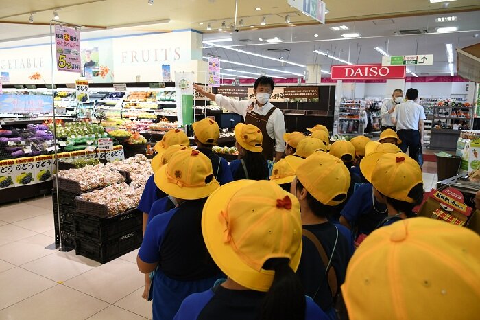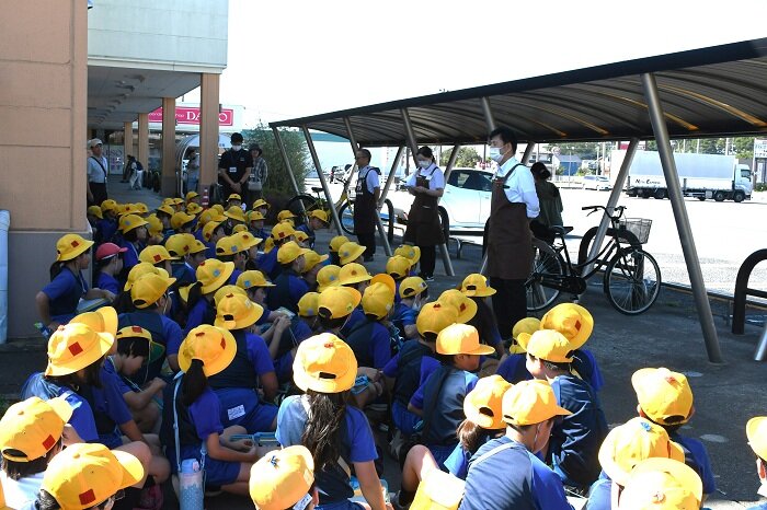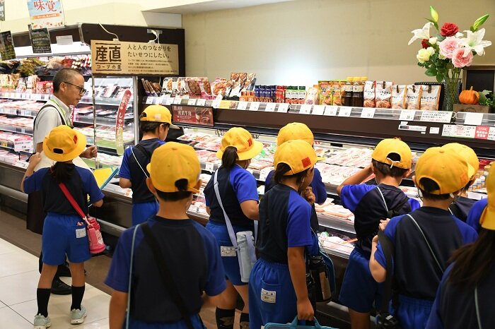 9月26日(金)、水戸市立吉沢小学校3年生105人(先生5人)が社会科見学として、コープ水戸店を見学しました。店舗で働く人たちの工夫や願いについて調べ、仕事とくらしの関係について理解することが見学の目的です。児童たちは4つのグループに分かれ、店内の売場やバックヤードを見学しました。