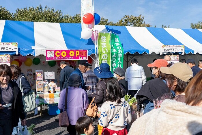 メイン会場ではいばらきコープの出展ブースで、子どもたちの野菜販売学習体験キッズ・マルシェ、コープデリ宅配配達員体験コーナーではお子さんたちが、子どもサイズの制服を着てトラックの運転席に乗り記念撮影、水戸センターのブースではいばらきコープのお知らせ、その他には未使用文房具必要としている方にお届けする活動をしている文房具回収とフードドライブの取り組みも行いました。キッズブースでは、環境問題を考えるきっかけとして、牛乳パックで紙すき体験を行いました。また、ポケットファームどきどき生産者によるトラック市やこだわり野菜模擬店、JAグループ茨城県産農畜産物PRコーナーなどイベントが盛りだくさんでした。