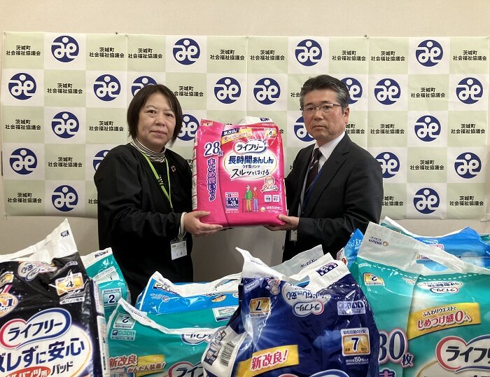 12月2日(火)、社会福祉法人 茨城町社会福祉協議会へ大人用紙おむつ126パックと尿取りパッド222パックを寄贈しました。いばらきコープでは注文間違いなどの理由で組合員さんがキャンセルされた商品を福祉施設やフードバンクへ寄贈する取り組みをすすめています。寄贈品は、茨城町社会福祉協議会にて、小島 正代組合員理事から茨城町社会福祉協議会 常務理事の小沼 芳久様へお渡ししました。お渡しした大人用紙おむつ等は支援を必要とされている方や、そのご家族など希望者に配布される予定です。
