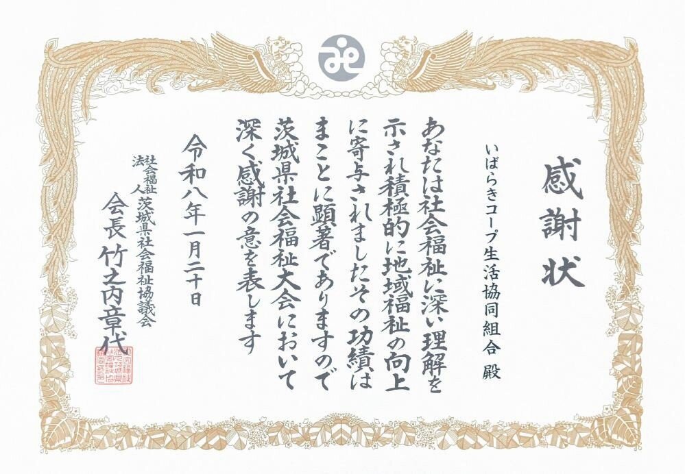 1月20日(火)、ザ・ヒロサワ・シティ会館(水戸市)において、「第75回茨城県社会福祉大会」が開催され、木村千秋理事長が列席しました。いばらきコープは、県内の社会福祉団体、社会福祉施設に多額の寄付、寄贈をされた団体として「茨城県社会福祉協議会会長感謝」の感謝状を拝受いたしました。