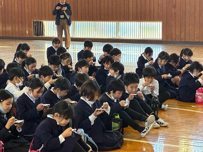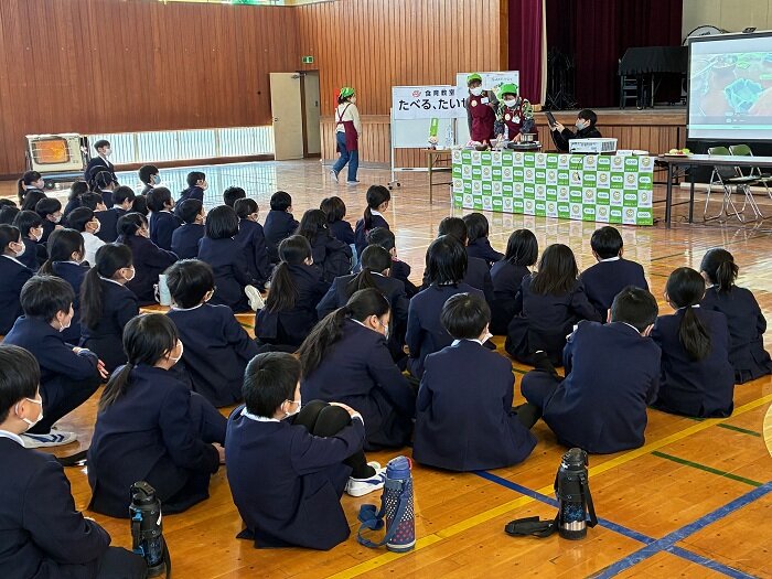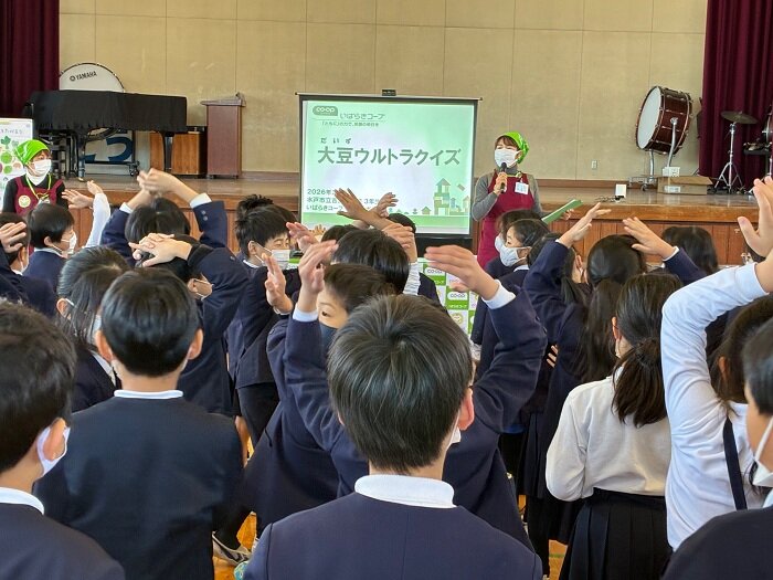 2月9日(月)、水戸市立吉沢小学校からの依頼を受け、食育サポーターが講師になって「食育教室 たべる、たいせつ」のプログラム「すがたをかえる大豆」と題した教室を開催しました。小学3年生の児童90名が体育館に集まり話を聞きました。食育サポーターは「日本では昔から、大豆がいろいろな食べものに姿をかえて食卓を支えてきたんですよ」と、大豆のひみつを紹介し、また豆腐作りの実演も行いました。子どもたちは、豆乳を絞ったあとに残る「おから」を間近で見たり、甘い匂いを嗅いだりと興味津々でした。また、お楽しみの試食タイムでは、できたての手作り豆腐と、豆腐と白玉粉で作ったもちもち食感の「みたらし団子」を味わい、児童たちはおいしそうに食べていました。