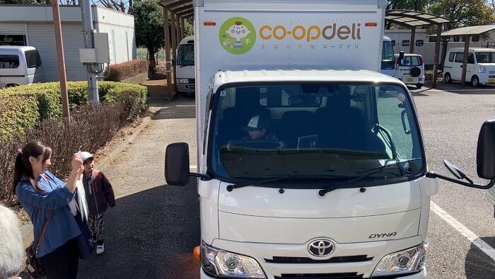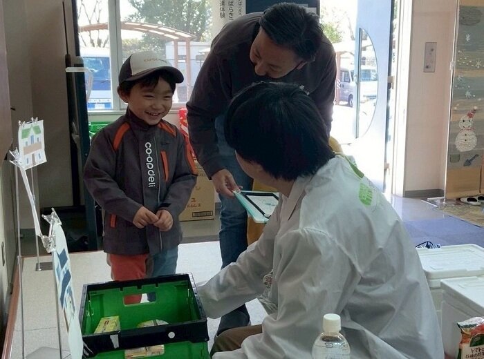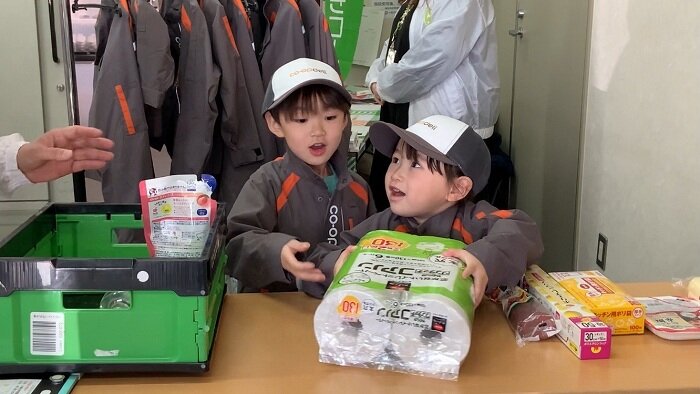 当日は12の団体が参加する中、いばらきコープでは宅配の職業体験ブースを出展し、76名の子どもたちが参加しました。体験内容は、配達担当者と同じ制服を着用し、宅配センターで朝礼時に実施している「8大用語」の唱和、お届けする商品のセット作業、配送トラックへの体験乗車、そして商品を組合員宅にお届けする体験をしていただきました。参加した子どもたちは笑顔で熱心に職業体験に取り組んでいました。