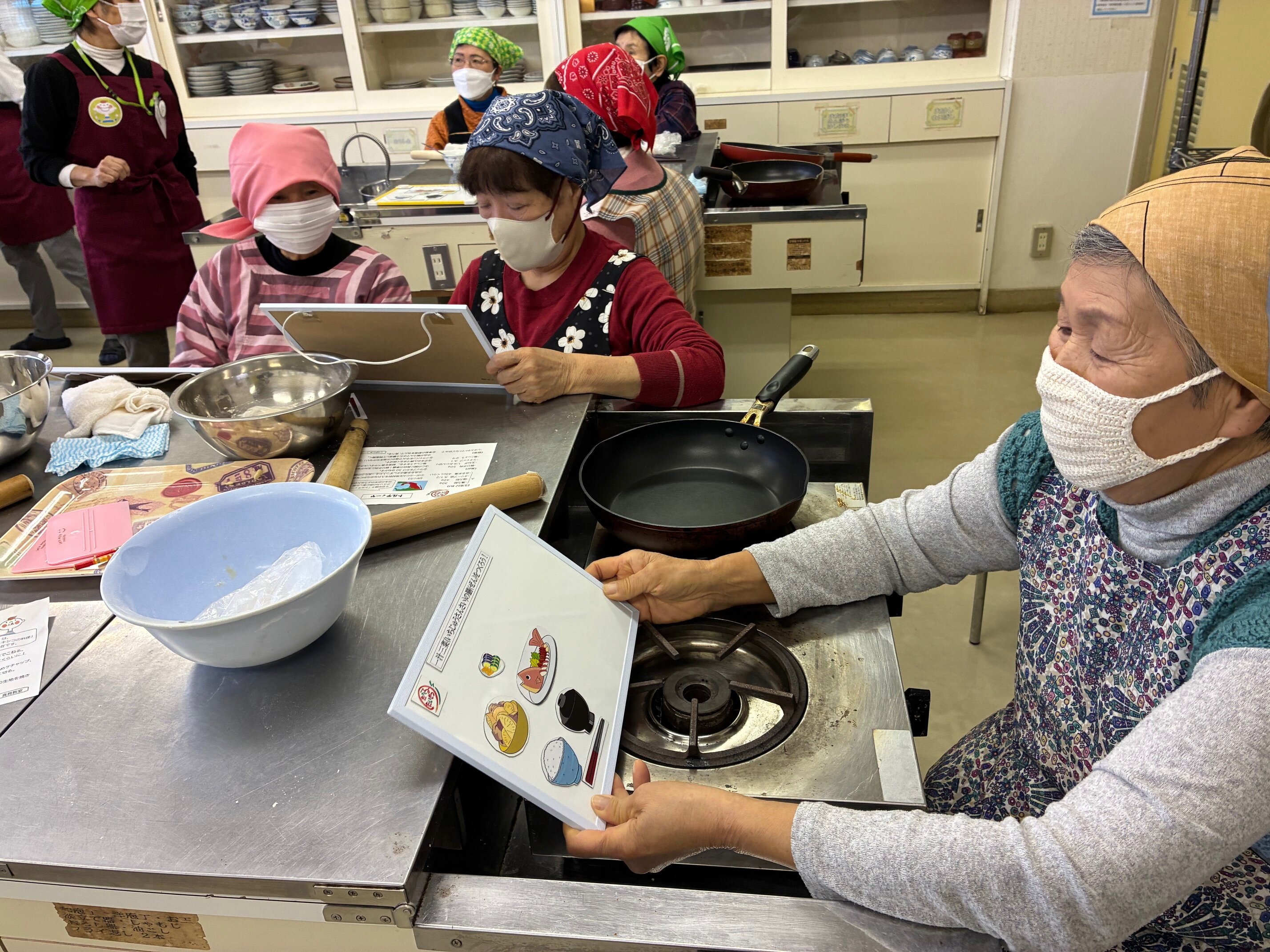 3月10日(火)、鹿嶋市立豊郷公民館にて食育教室「地産地消・茨城を食べよう」を開催しました。食育サポーターが参加者14名の皆さんとともに、料理やゲームを通じて茨城の食の魅力について学びました。野菜をたっぷり使用したトルティーヤづくりでは、まずはトルティーヤを作りました。生地をこねて寝かせ、麺棒で薄く延ばして焼き上げました。形は個性的でも味は良く、たっぷりの野菜を包んで、地元の恵みを味わいました。生地を寝かせている間、地産地消の大切さや郷土料理について交流しました。参加者の方から、鹿嶋の伝統食「ごさい漬け(イワシの漬物)」について教わるなど、地域ならではの話題で盛り上がりました。食育のゲームとして「一汁三菜ゲーム」や、箸使いの基本を学ぶ「大豆の豆つかみリレー」を実施。真剣ながらも笑顔あふれる時間となりました。