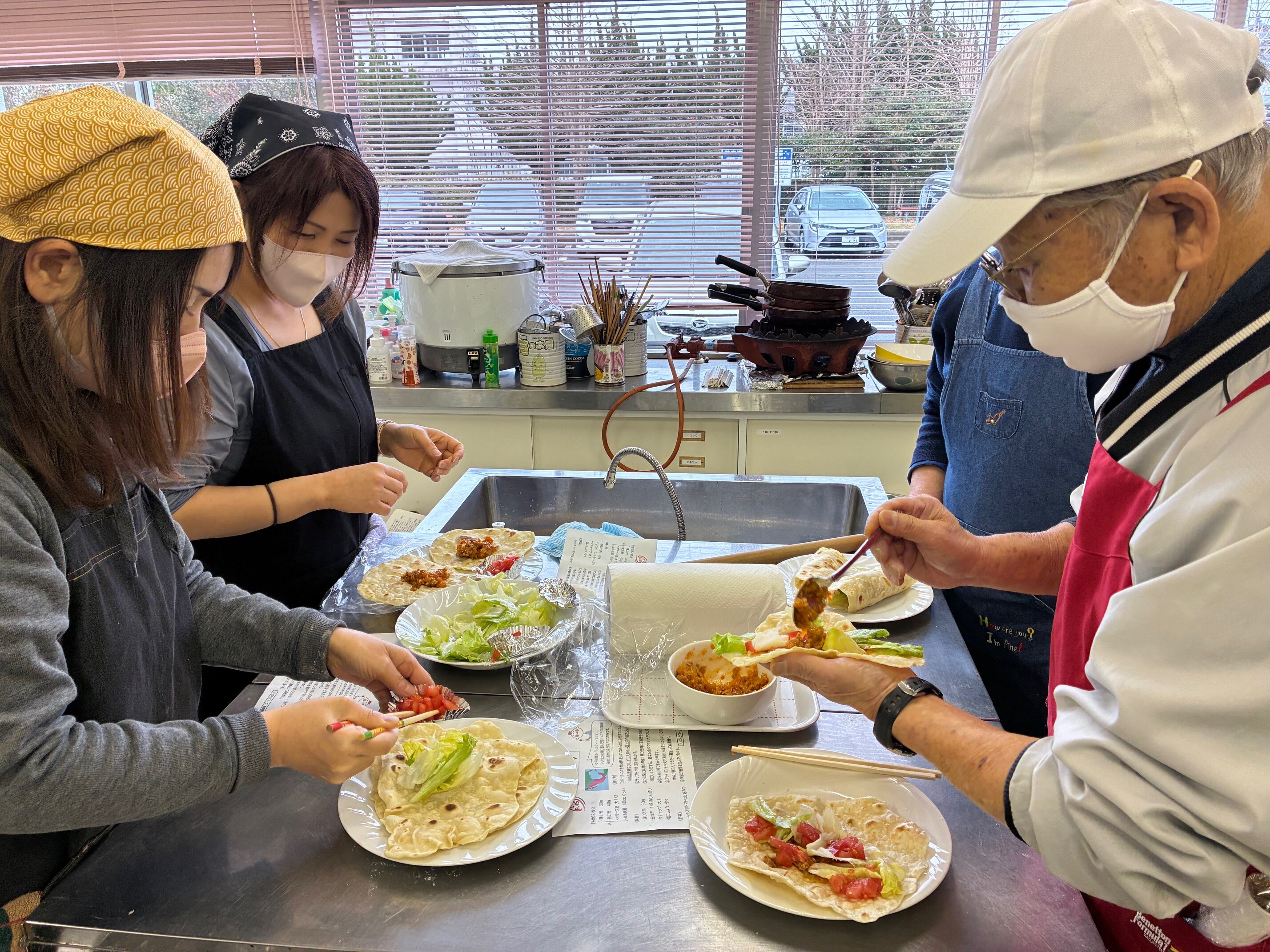 参加者からは「沢山のスタッフがいらしゃったので、手際よく料理を楽しめました。作り方も簡単で美味しかったです」「野菜を沢山食べることが出来とても良かったです」や「鹿嶋の郷土料理の話など、地域の話で盛り上がり楽しかったです。息子が好きなので、自宅でもトルティーヤを作りたいと思います」などの感想が寄せられました。
