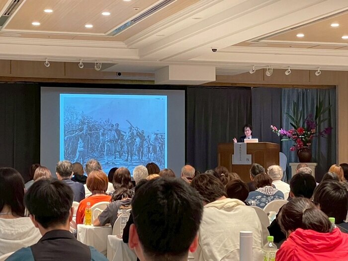 1日目の全体会では、参加メンバー同士で事前学習の内容や参加への想いを交流しました。また、「那覇青少年舞台プログラム」による迫力ある演舞の鑑賞や、戦場での実体験を伝える最後の世代として平和講話を行っている玉木利枝子さんのお話を伺い、学びを深めました。