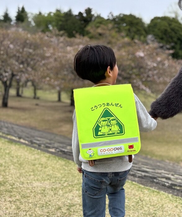 いばらきコープは、地域の道路をお借りして事業を行わせていただいていることからも、安全運転を使命とし、その誓いの一つとして「ランドセルカバー」及び「横断旗」を寄贈させていただいています。誰でも安心して暮らせる地域づくりのために、これからも子育て応援や学校教育活動への協力を進めていきます。
